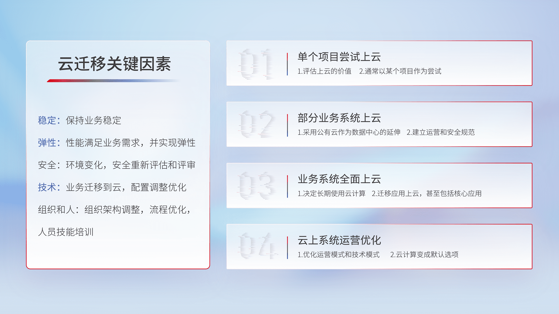 结合实际业务,,从规划设计、、、、云平台选型、、、、云原生改造、、、、数据迁移、、、、集成交付,,,迁移全过程为客户识别最佳上云路径,,做好风险识别管理,,设计网络架构、、、、身份权限、、、安全审计合规、、、、操作审计、、日志审计、、监控告警策略、、多站点容灾设计等,,,对云上基础设施进行整体规划,,提升IT治理水平,,以满足弹性、、、、高可用、、、高性能的需求。。